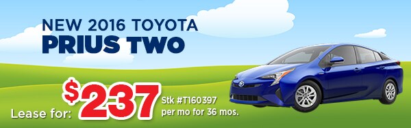 Stk# T160397. VIN G3002365. MSRP $25,260. Closed-end lease for 2016 Toyota Prius Two for $237/mo plus tax for 36 mos on approved tier 1+ credit. Gross Cap Cost $24,945. Net Cap Cost $22,684.23. 12k miles/year with $.15/mile thereafter. $2,499 due at lease signing after the application of $961 dealer non-cash credit (includes 1st payment, $0 security deposit, $134 dealer document processing charge, tax, license, and fees.) Down payment may be required. Expires 4/5/2016Buy the 2016 Toyota Prius C Two for
